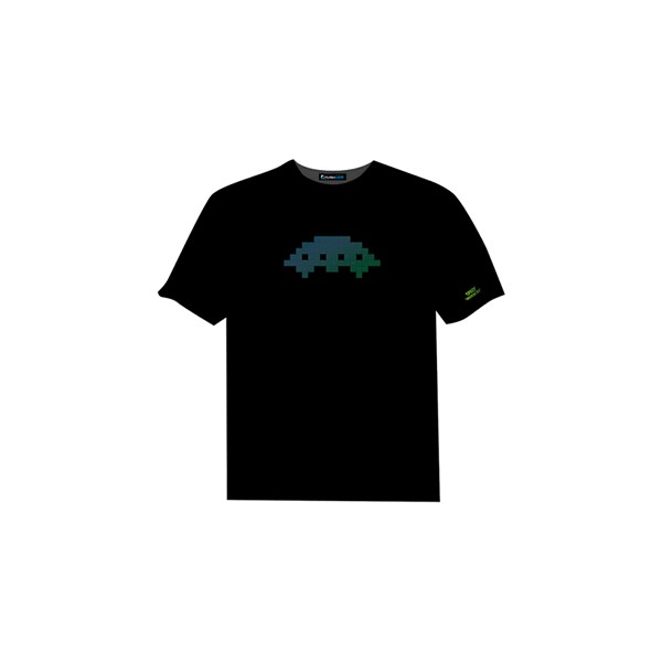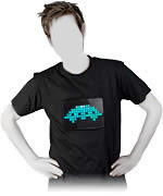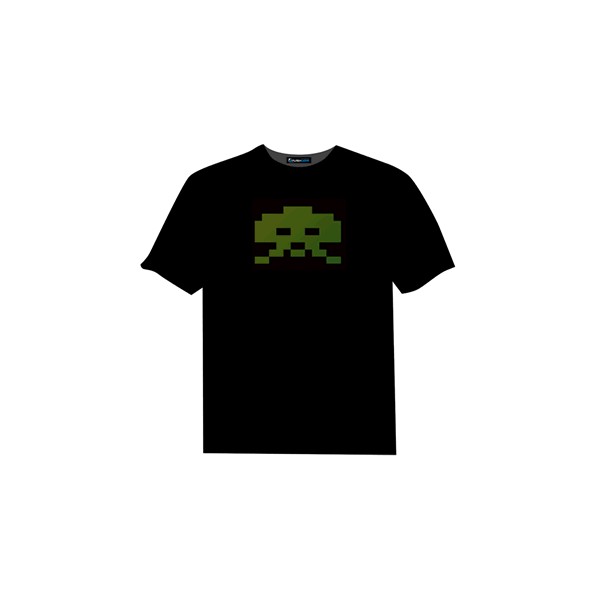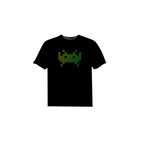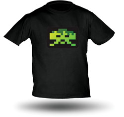 Nas nostálgicas arcadas e até aterrorizando o Tom Cruise numa verdadeira Guerra dos Mundos eles tentaram dominar o mundo. Você, corajoso como é, até os traz ao peito a brilhar numa realidade alternativa e bidimensional... Esta T-Shirt é da família das T-qualizador, pois reage à música e som ambiente, palmas e cantares, brilhando para si. Para isso acontecer, juntou-se o melhor de cada mundo: a incrível flexibilidade dos materiais electroluminescentes, com a tecnologia compacta de um sensor inteligente, com um design retro super-especial. A colecção está disponível sempre com fundo negro espacial, e em diferentes naves do lendário videojogo de arcada, Space Invaders.