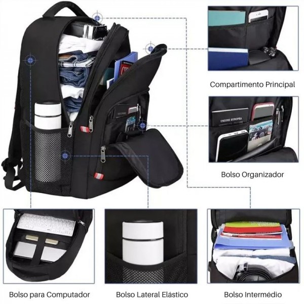 A Mochila Anti Roubo tem mais de 15 bolsos separados para armazenamento e organização de artigos!