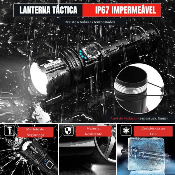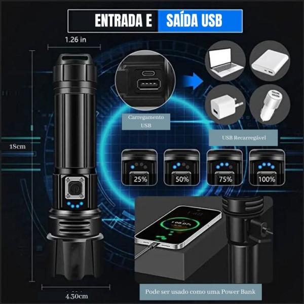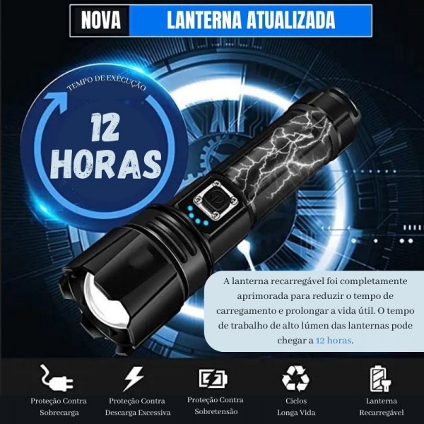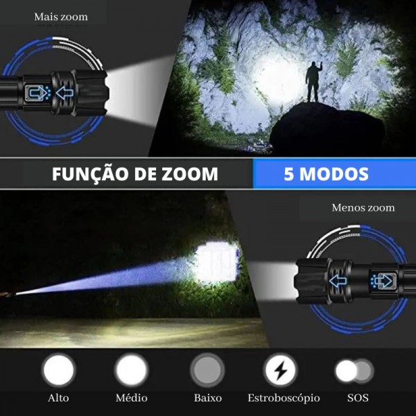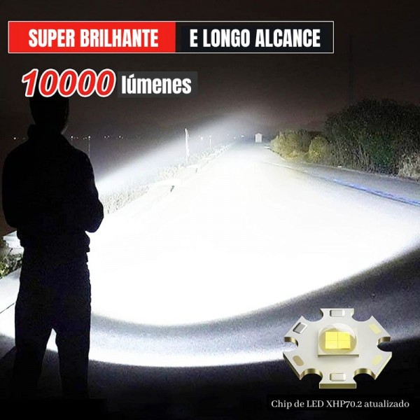 O nosso LED de Alta Potência proporciona um raio incrivelmente potente, 10 vezes mais brilhante do que uma lanterna normal.